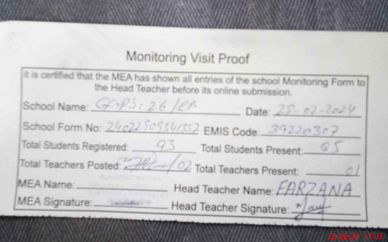| Attendance Register | Head Teacher | MEA with School | Visit Proof |