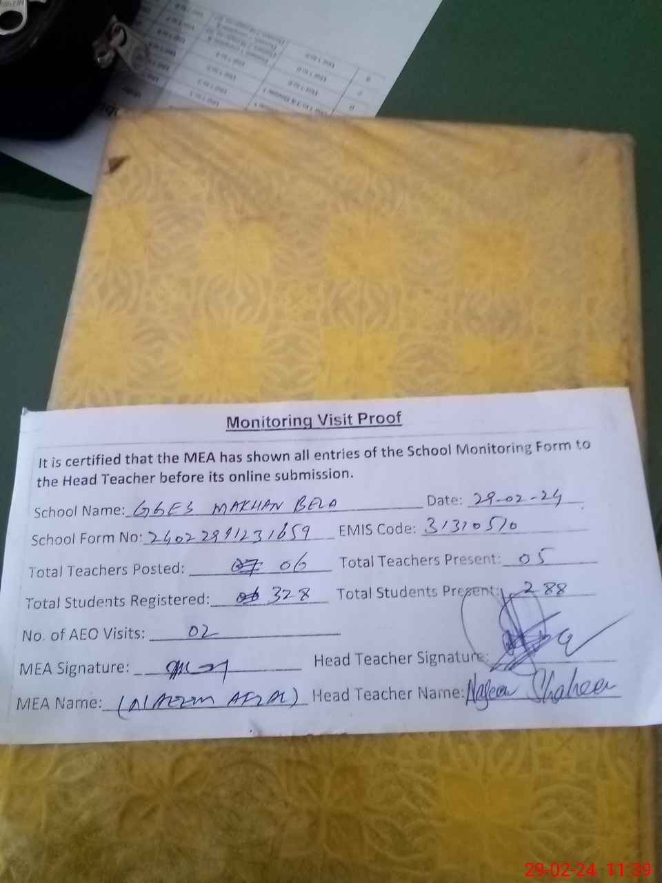 | Attendance Register | Head Teacher | MEA with School | Visit Proof |