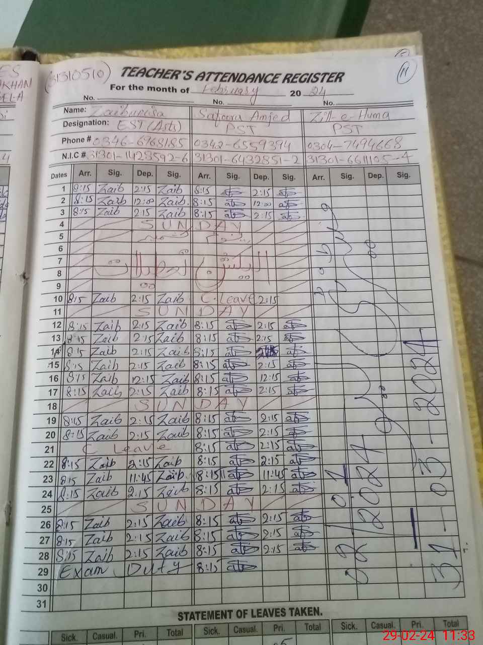 | CNIC | Full Name | Designation | R/C | Absence During Last Calender Month |