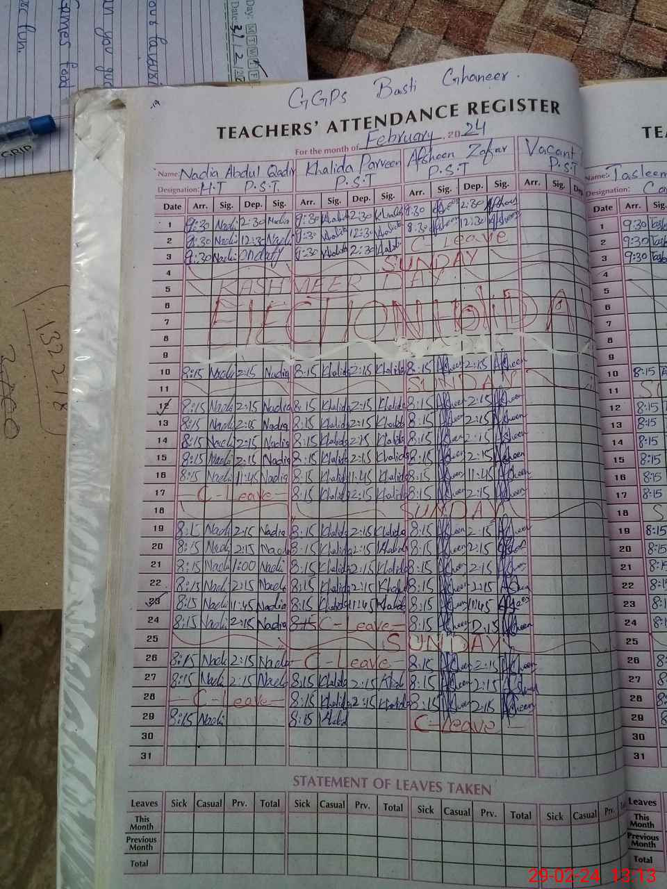 | CNIC | Full Name | Designation | R/C | Absence During Last Calender Month |