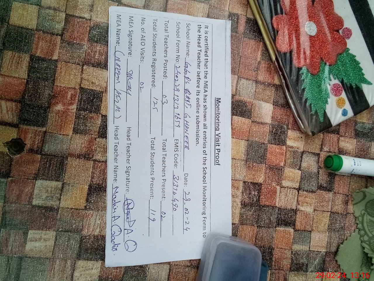| Attendance Register | Head Teacher | MEA with School | Visit Proof |
