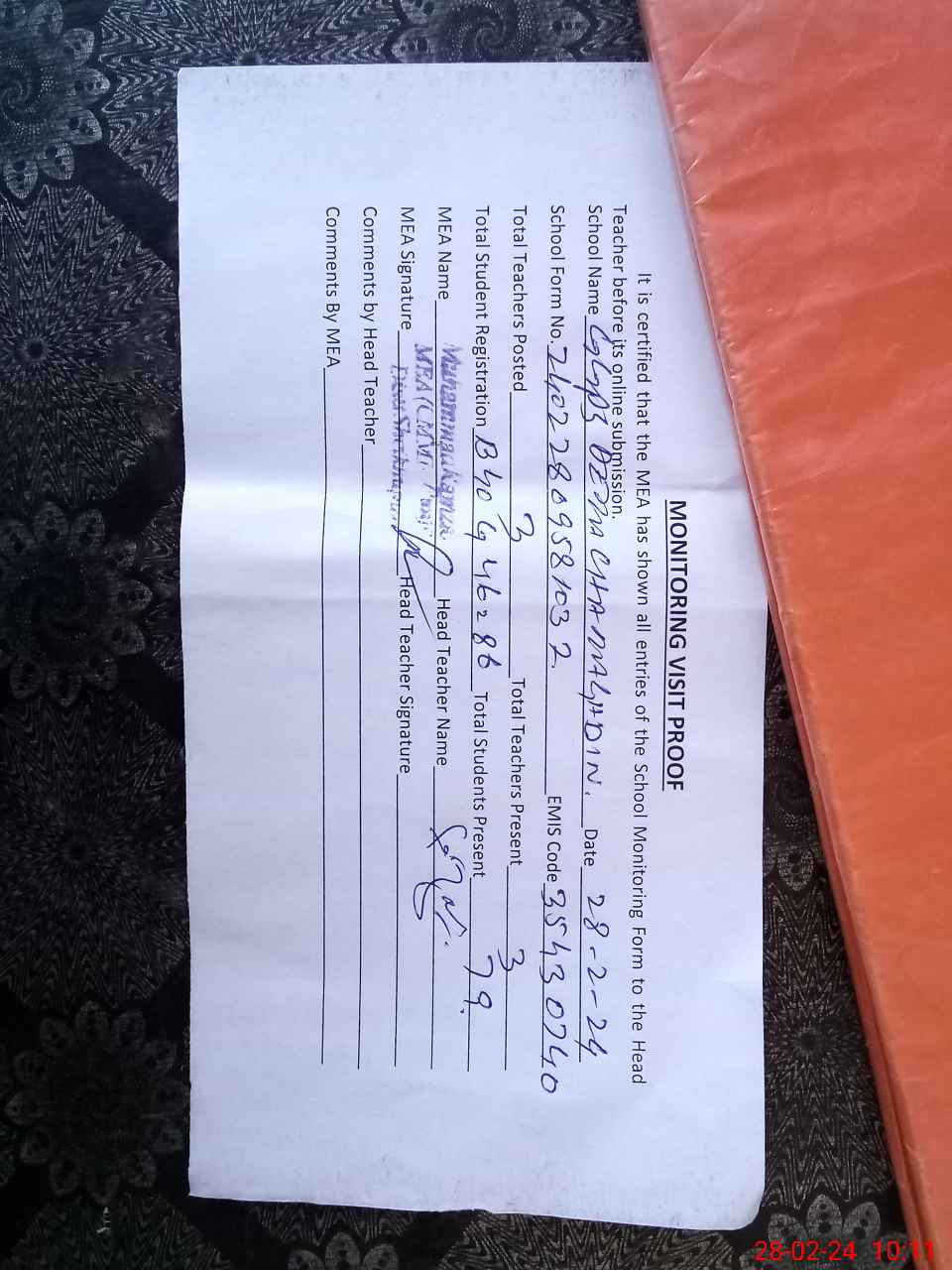 | Attendance Register | Head Teacher | MEA with School | Visit Proof |