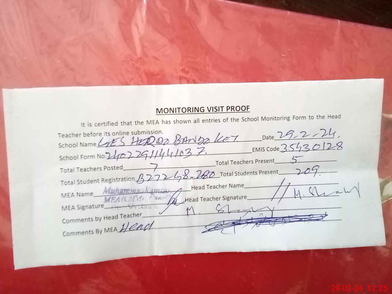 | Attendance Register | Head Teacher | MEA with School | Visit Proof |