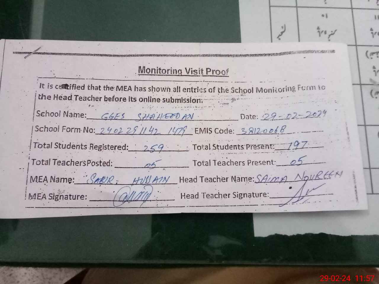 | Attendance Register | Head Teacher | MEA with School | Visit Proof |