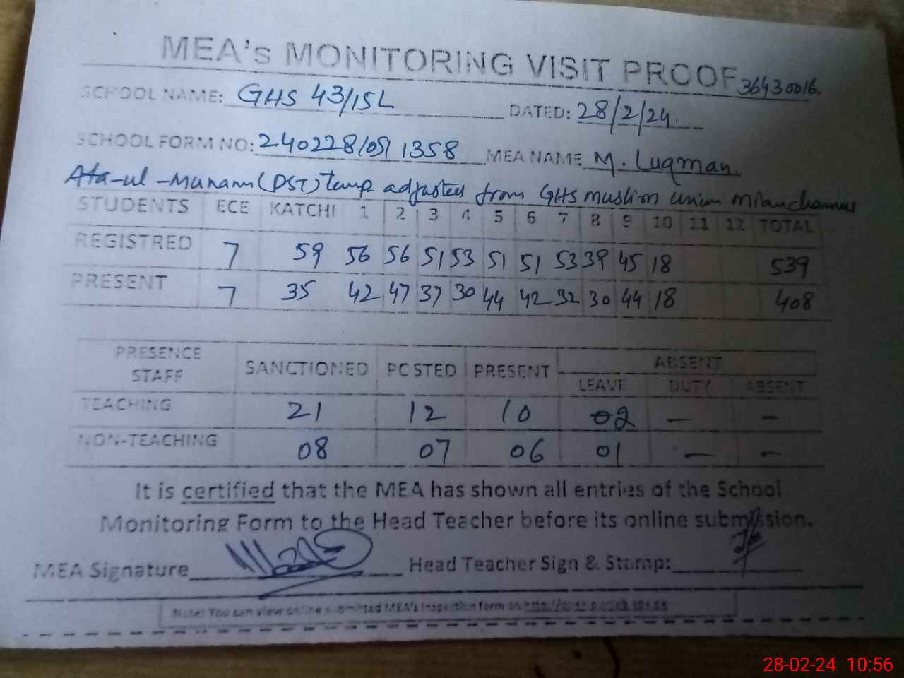 | EMIS Code: 36430016 | Name of School: GHS 43/15-L, MIAN CHANNU | |||