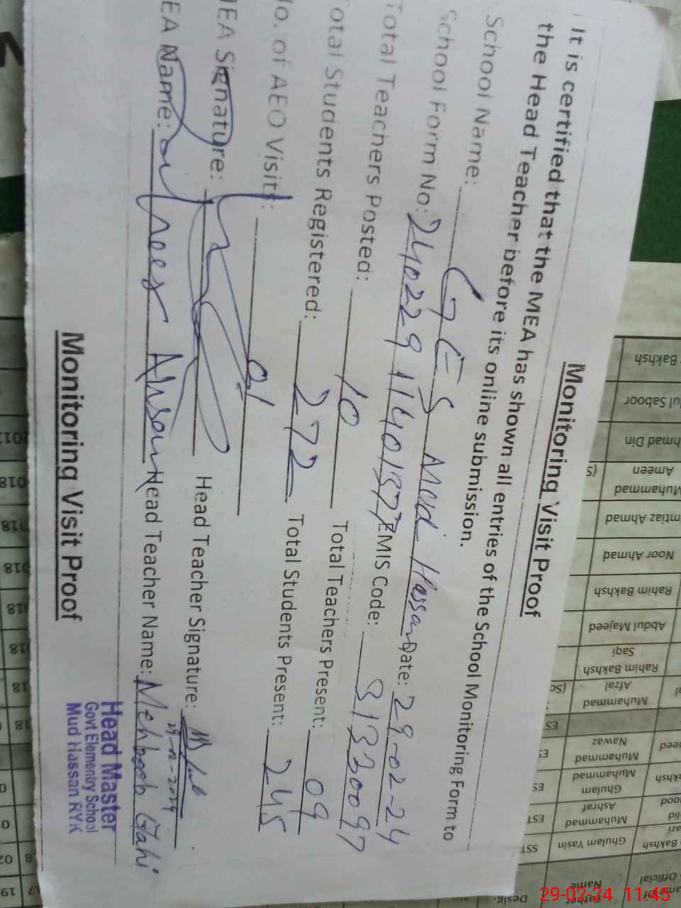 | Attendance Register | Head Teacher | MEA with School | Visit Proof |