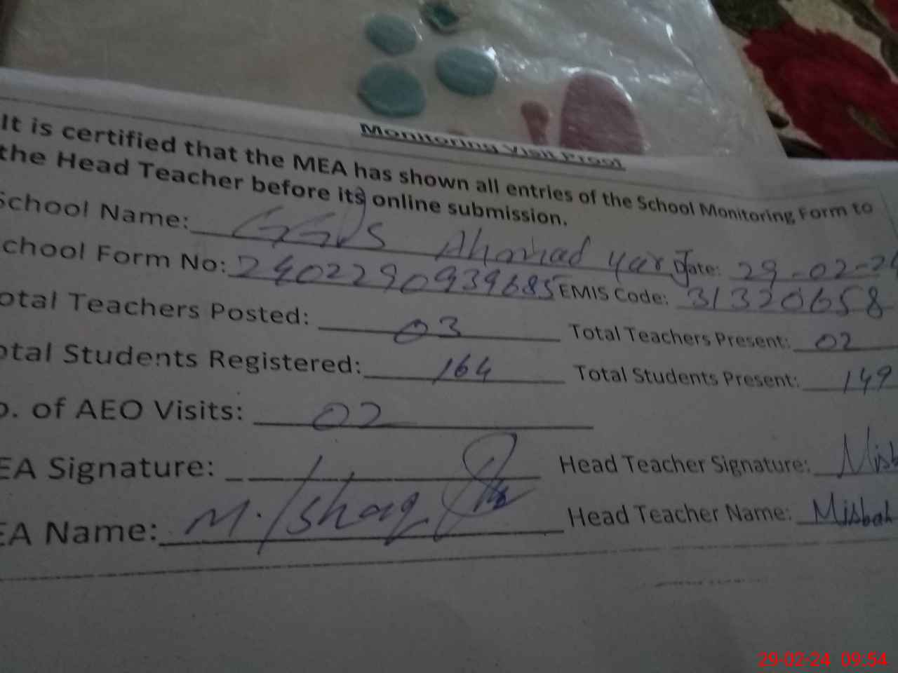 | Attendance Register | Head Teacher | MEA with School | Visit Proof |
