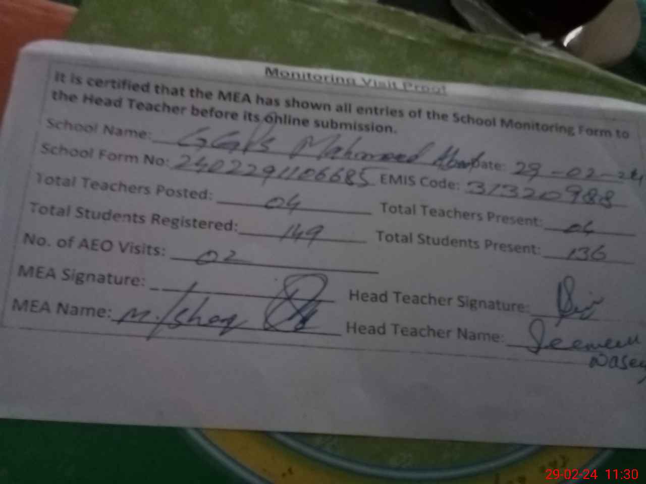 | EMIS Code: 31320988 | Name of School: GGPS MAHMOOD ABAD | |||