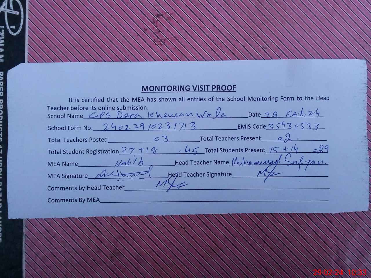 | EMIS Code: 35430533 | Name of School: GPS DERA KHEWAN WALA | |||