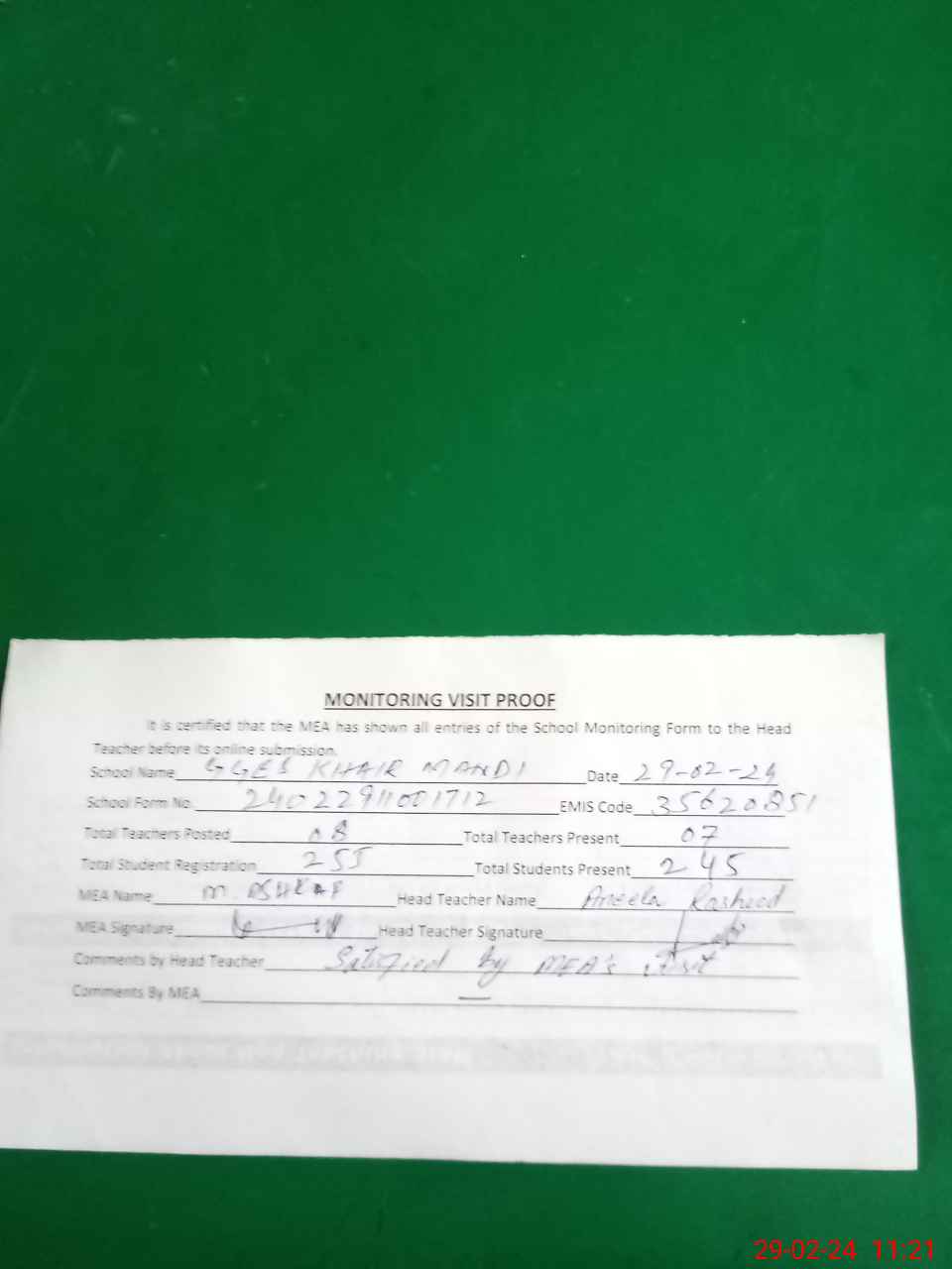 | Certified that this School was Inspected by the Undersigned MEA/DMO Today and the Information Stated Above is as Per Record. | |||||