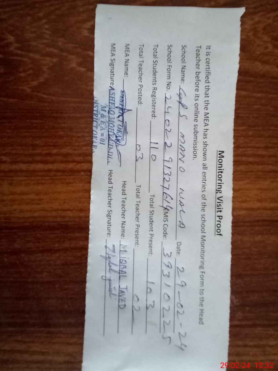 | EMIS Code: 39310225 | Name of School: GPS MANO WALA | |||