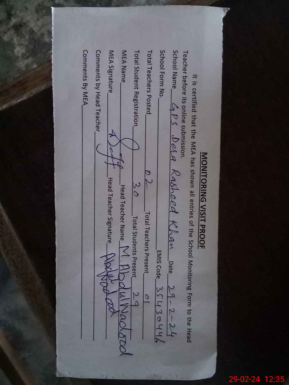 | Attendance Register | Head Teacher | MEA with School | Visit Proof |