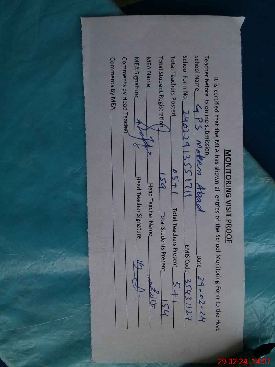 | Certified that this School was Inspected by the Undersigned MEA/DMO Today and the Information Stated Above is as Per Record. | |||||
