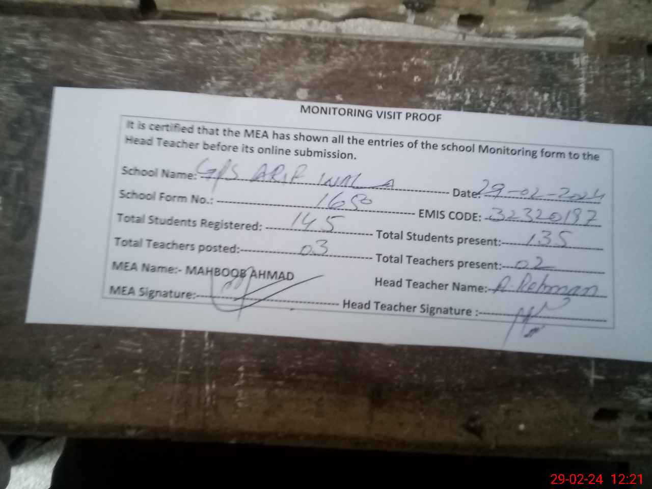 | Attendance Register | Head Teacher | MEA with School | Visit Proof |