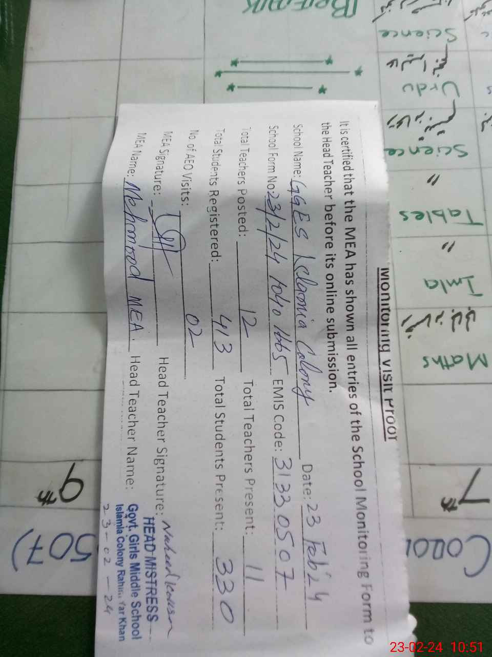| Attendance Register | Head Teacher | MEA with School | Visit Proof |