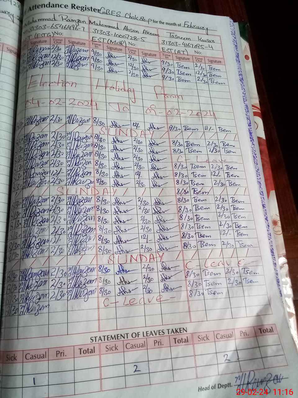| 31**** | Mu**** Sh**** | 1 | 1 | 0 | 0 | 0 | 0 | 0 | 0 | 0 | 0 | 0 | Exam Duty |