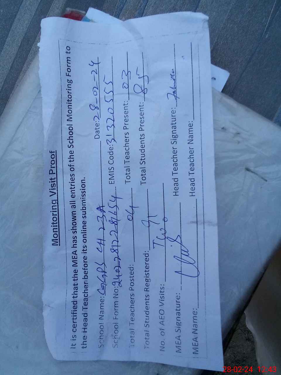 | Attendance Register | Head Teacher | MEA with School | Visit Proof |