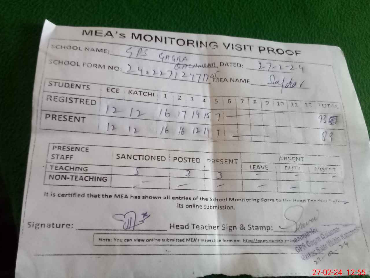 | Attendance Register | Head Teacher | MEA with School | Visit Proof |