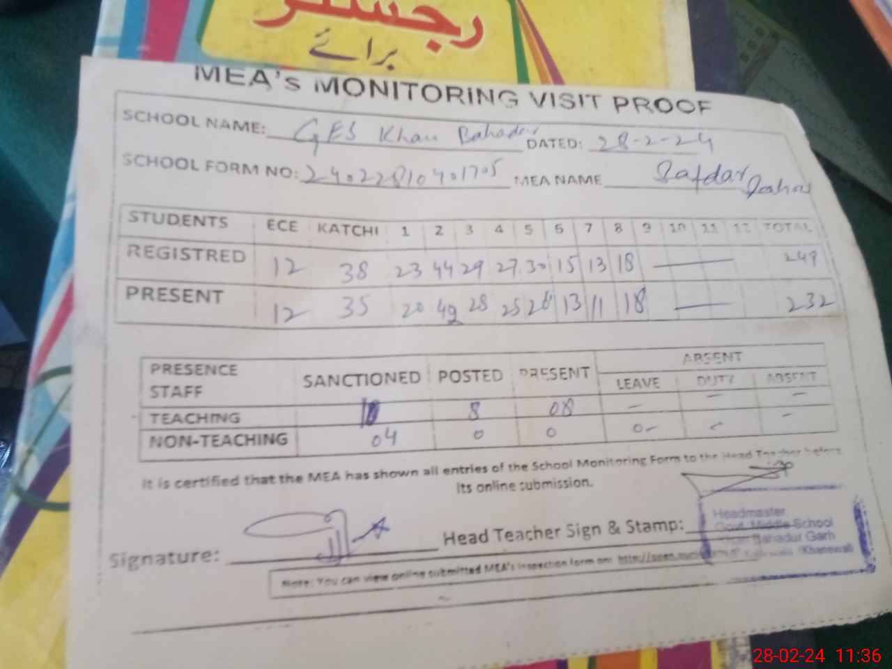 | Attendance Register | Head Teacher | MEA with School | Visit Proof |