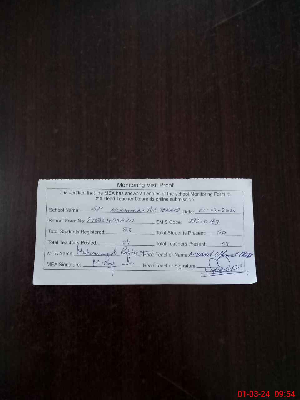 | Attendance Register | Head Teacher | MEA with School | Visit Proof |