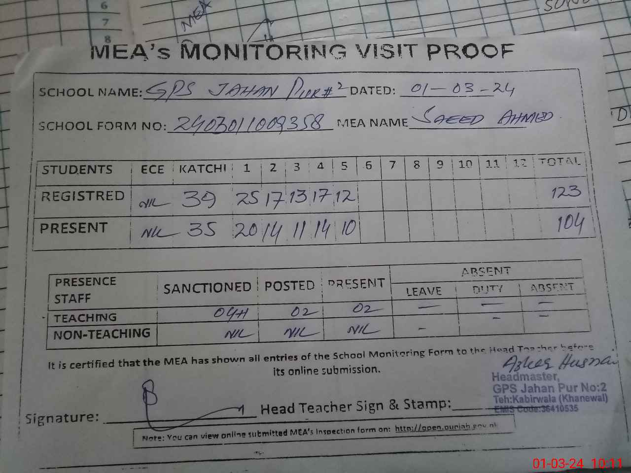 | EMIS Code: 36410535 | Name of School: GPS JAHAN PUR NO.2 P/O NOOR PUR, KABIRWALA | |||