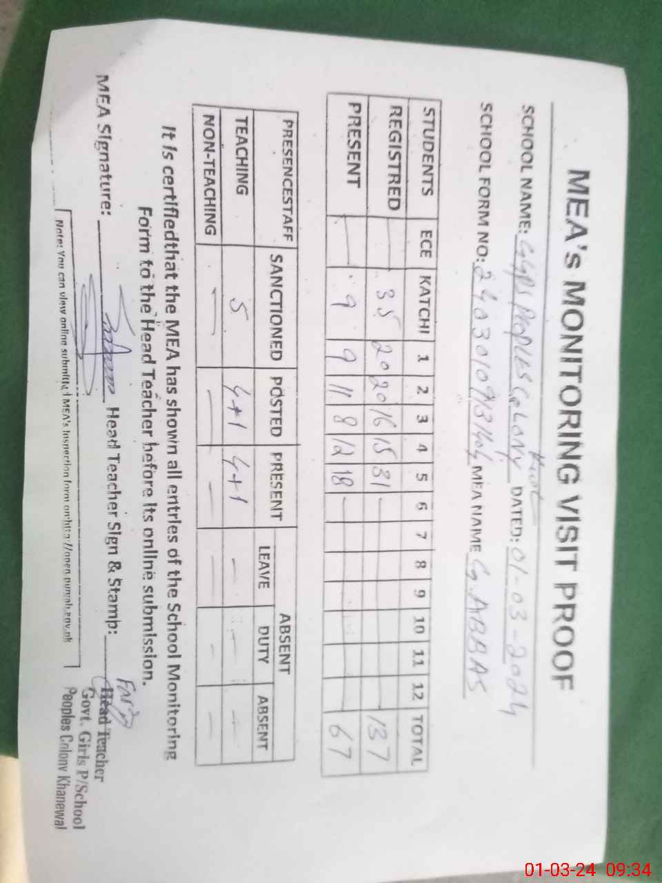 | EMIS Code: 36420350 | Name of School: GGPS PEOPLES COLONY, KHANEWAL | |||