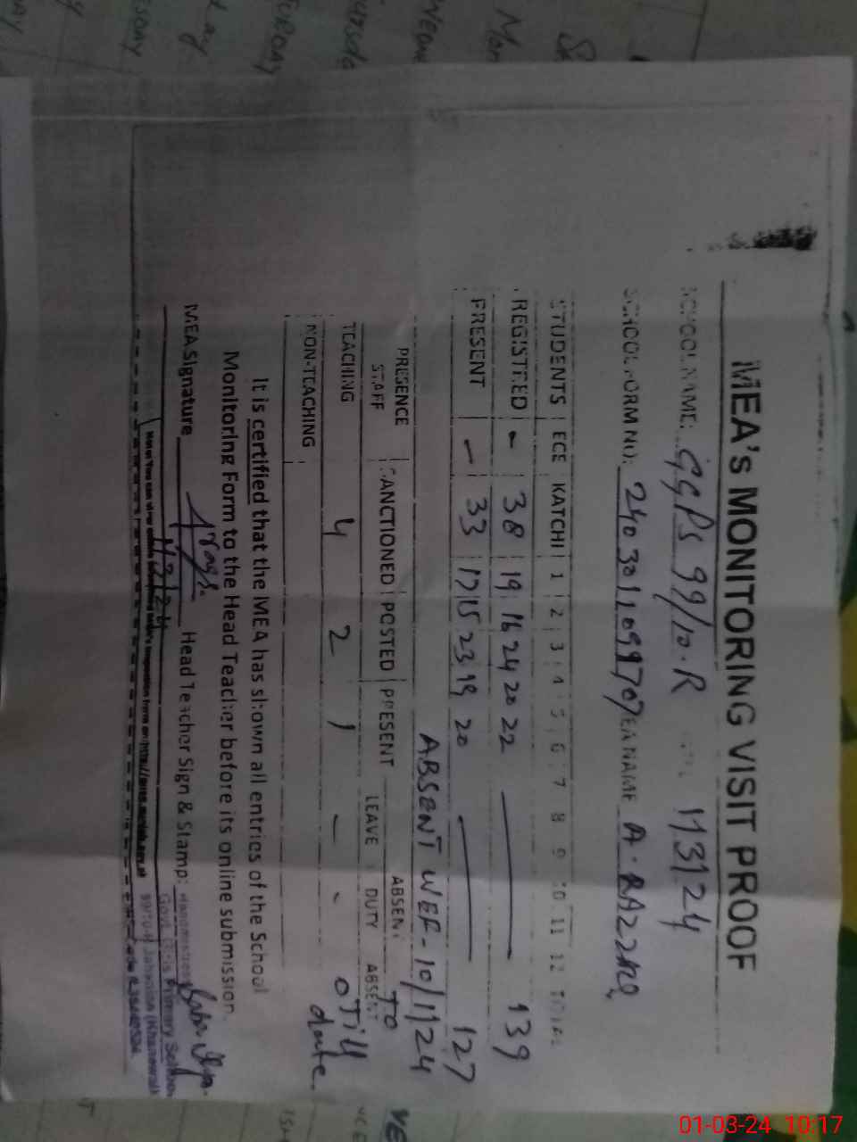 | Attendance Register | Head Teacher | MEA with School | Visit Proof |