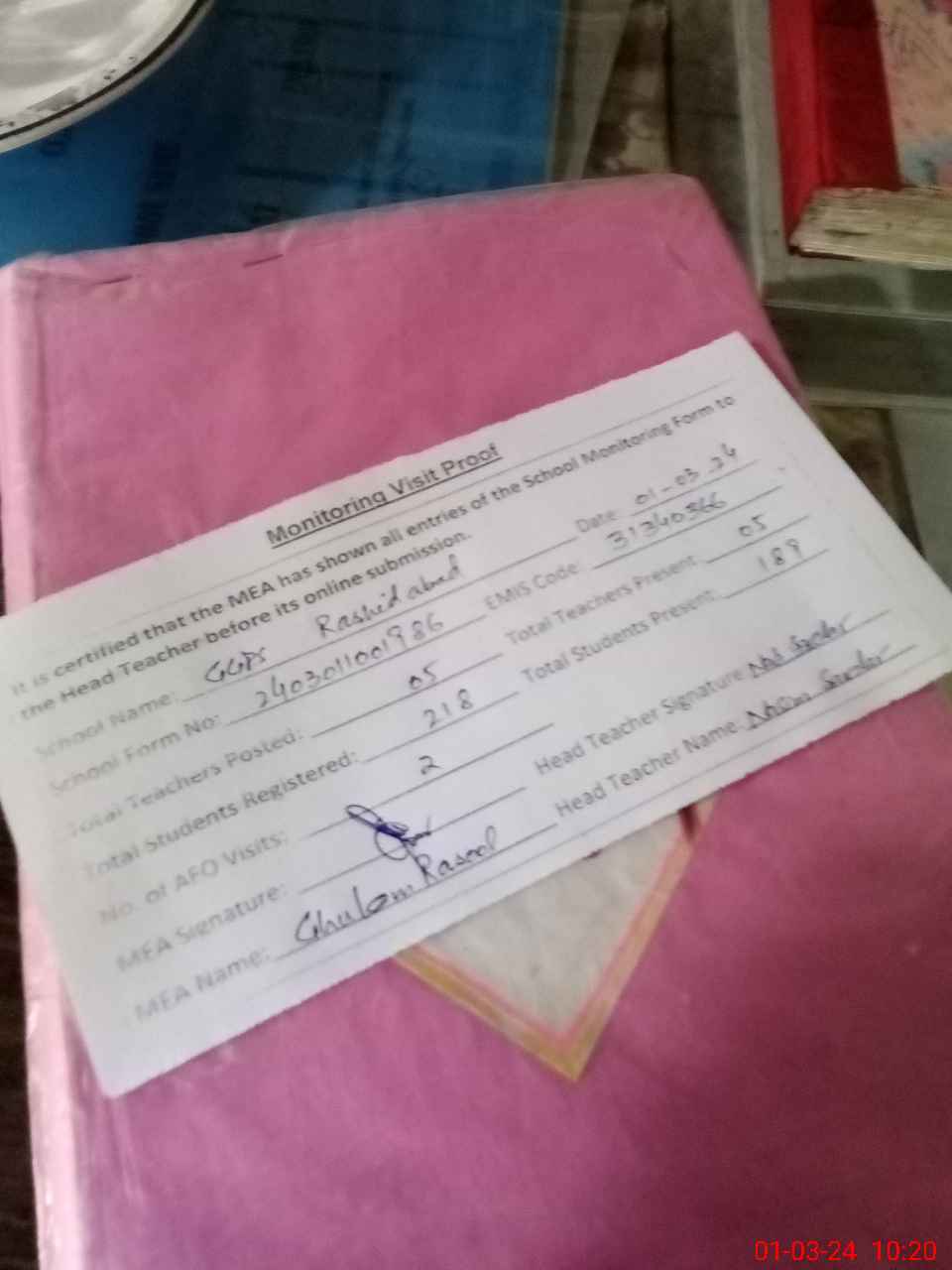 | Attendance Register | Head Teacher | MEA with School | Visit Proof |