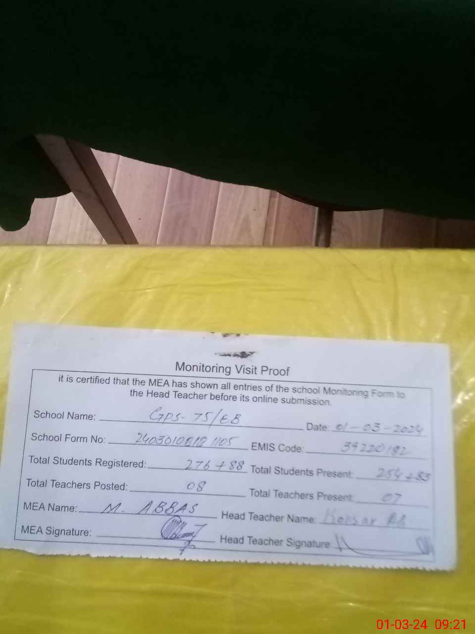 | Attendance Register | Head Teacher | MEA with School | Visit Proof |