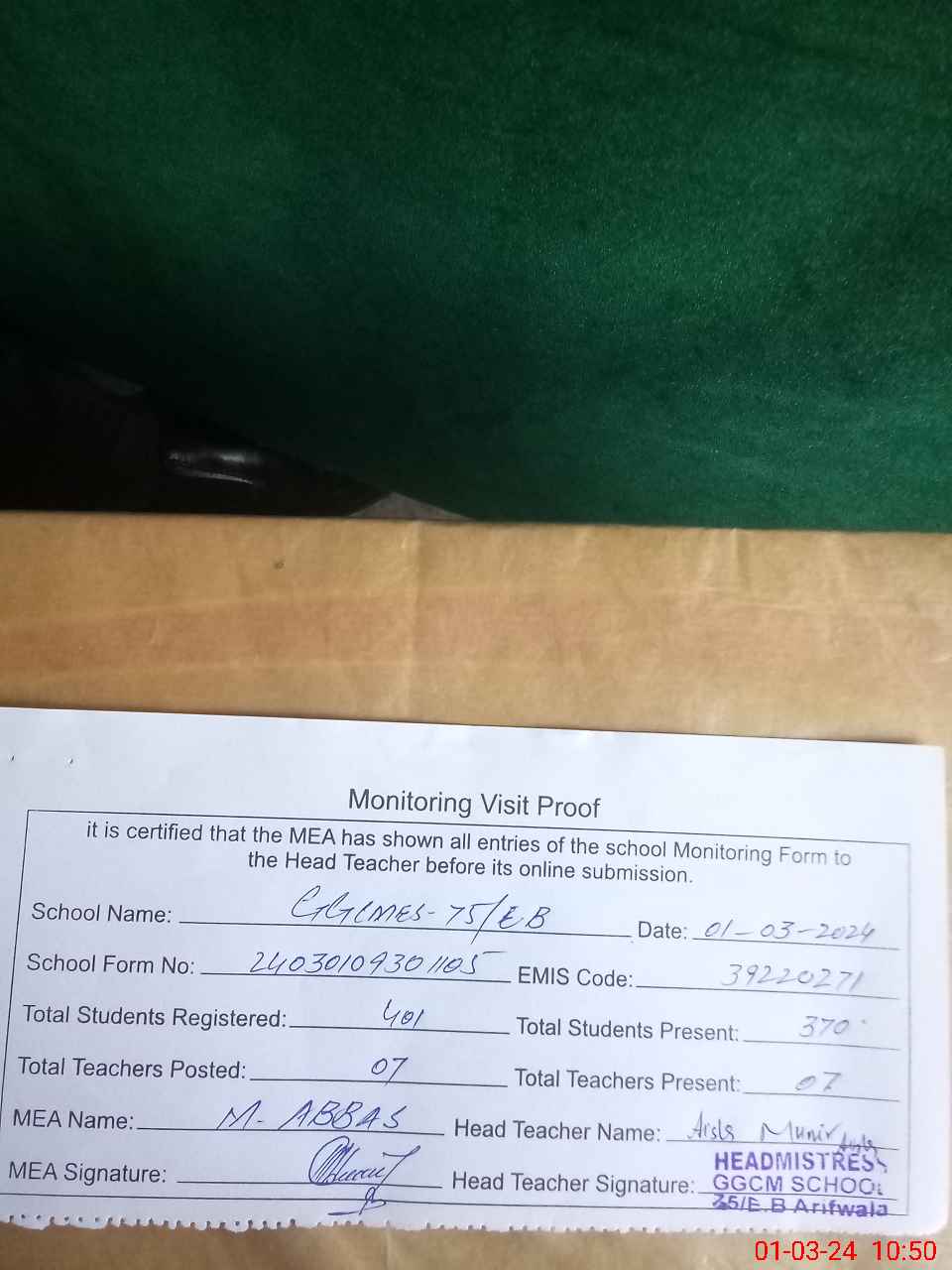 | Certified that this School was Inspected by the Undersigned MEA/DMO Today and the Information Stated Above is as Per Record. | |||||