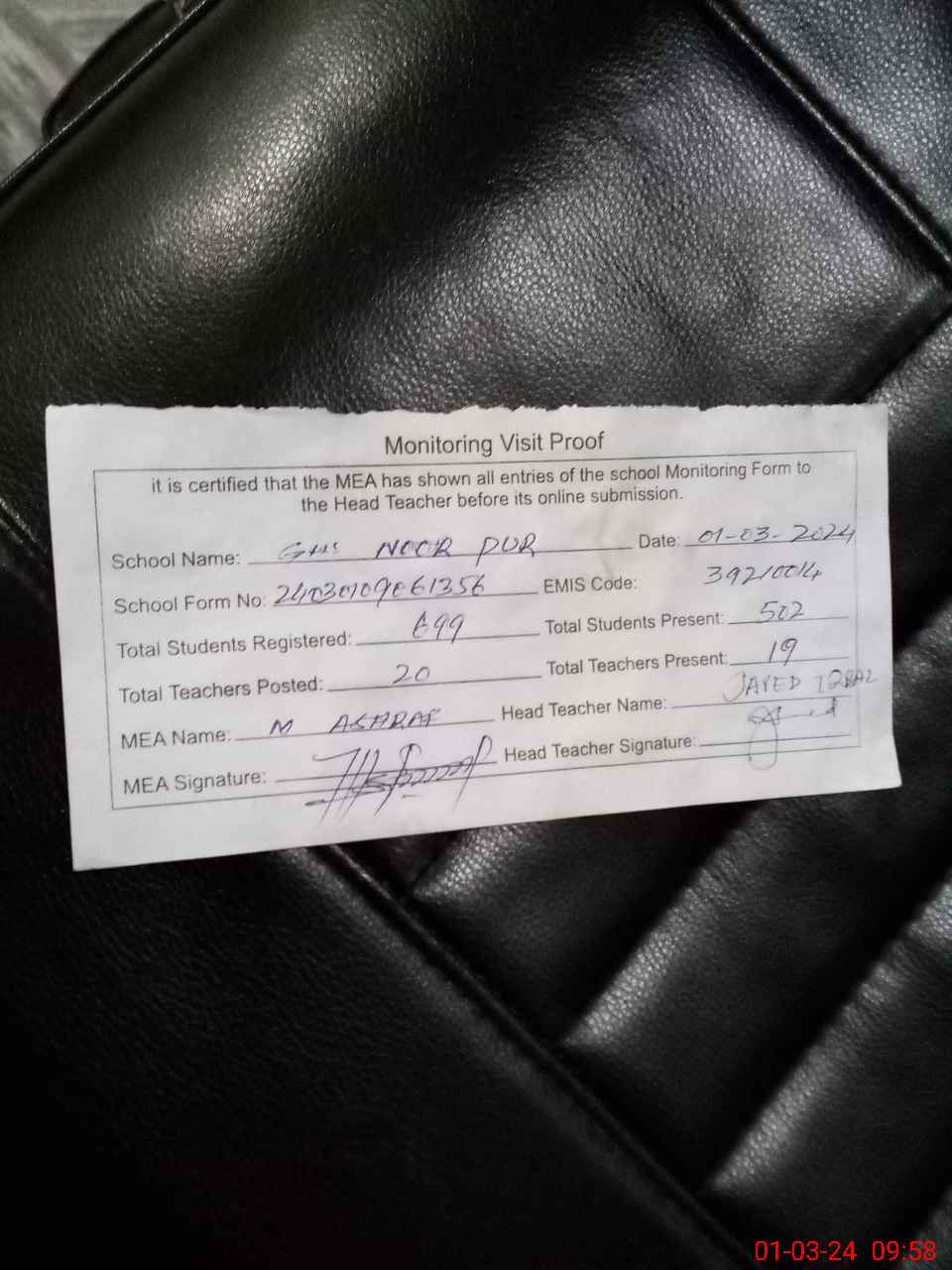 | Attendance Register | Head Teacher | MEA with School | Visit Proof |