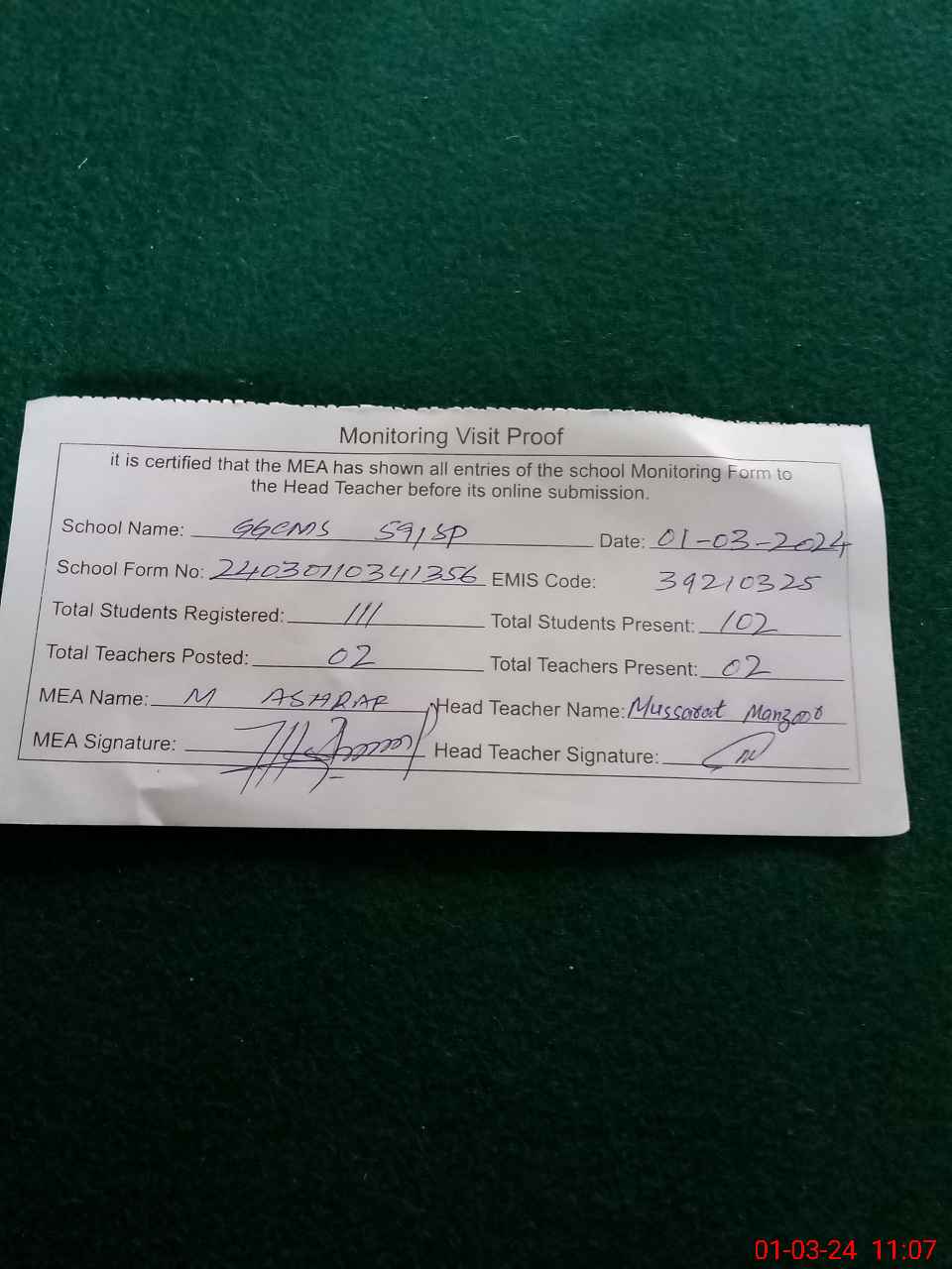 | Attendance Register | Head Teacher | MEA with School | Visit Proof |