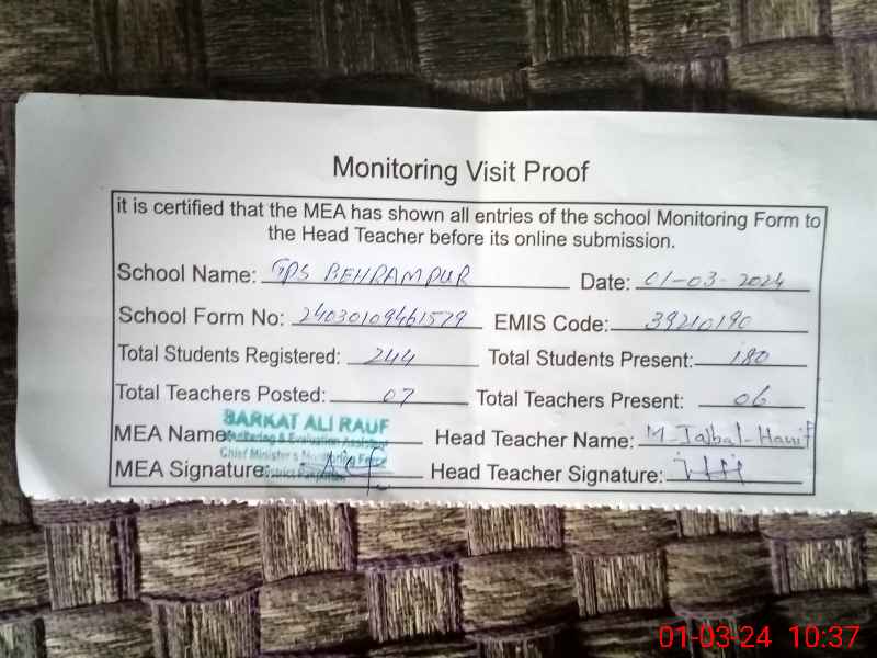 | EMIS Code: 39210190 | Name of School: GPS BEHRAM PUR PO PAKPATTAN | |||