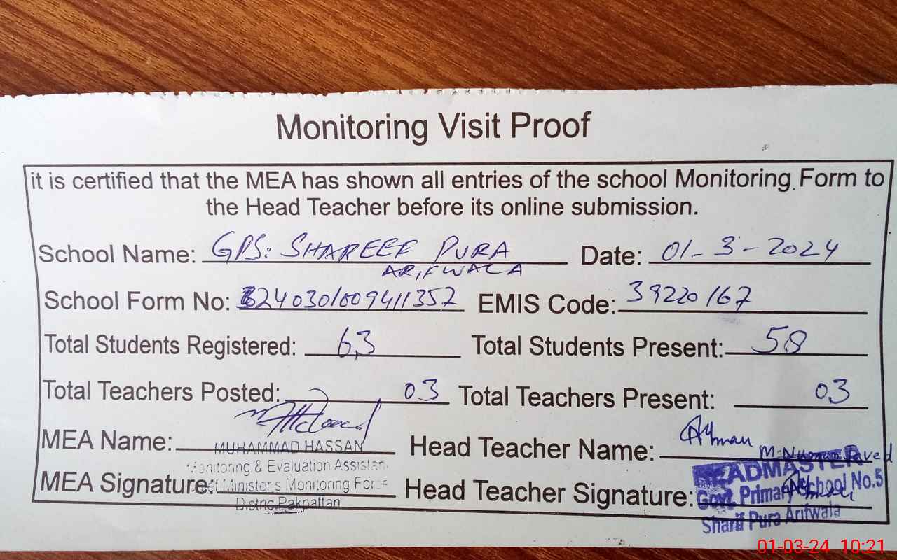 | EMIS Code: 39220167 | Name of School: GPS MOHALLA SHARIF PURA | |||