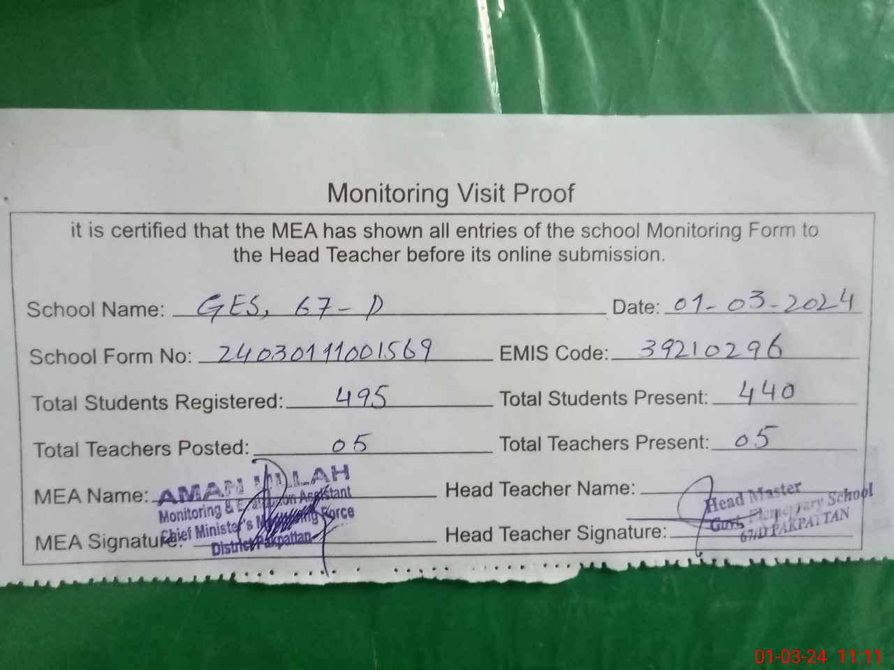 | EMIS Code: 39210296 | Name of School: GHS 67 D | |||