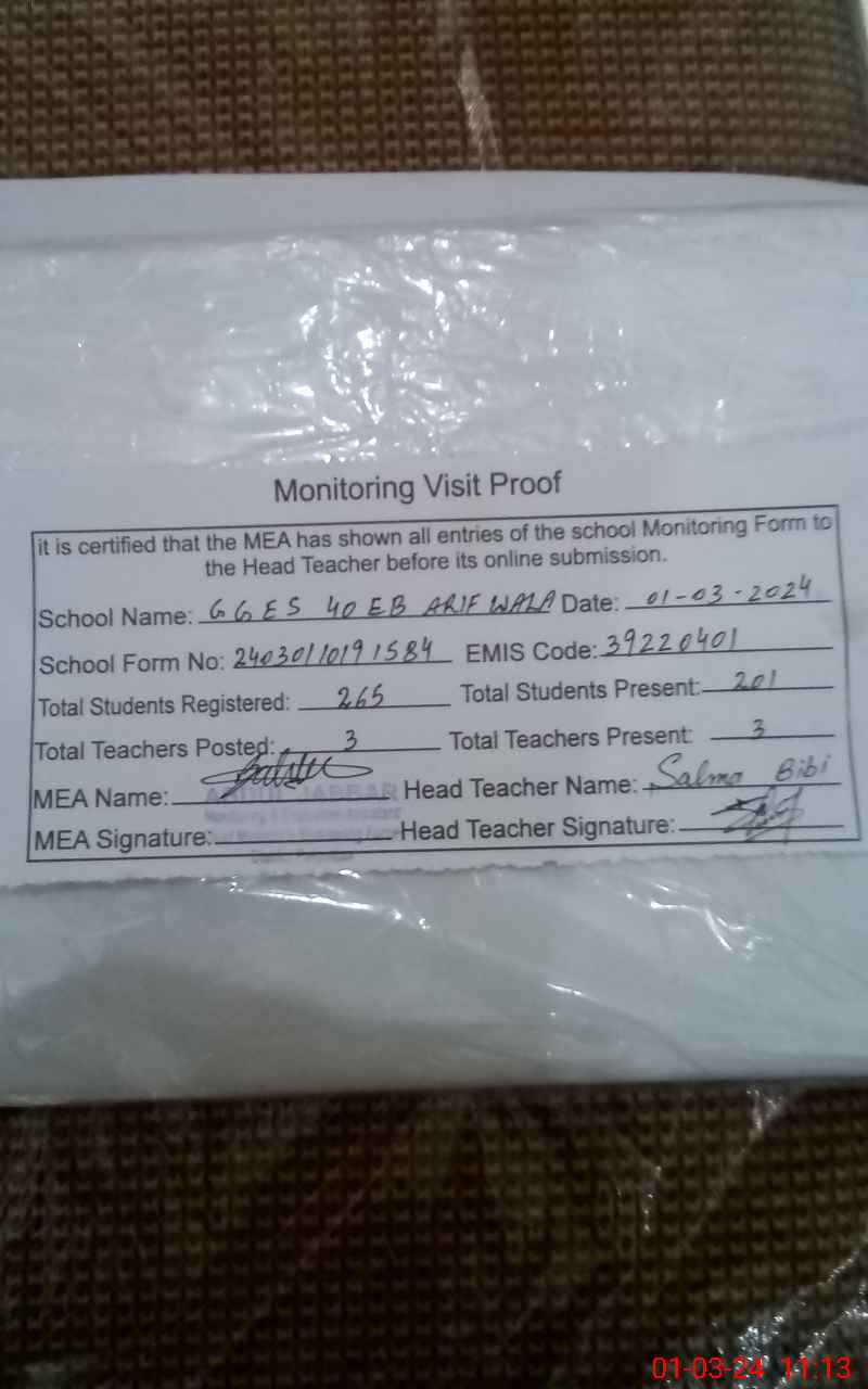 | EMIS Code: 39220401 | Name of School: GGES 40 EB PO 40 EB ARIF WALA | |||