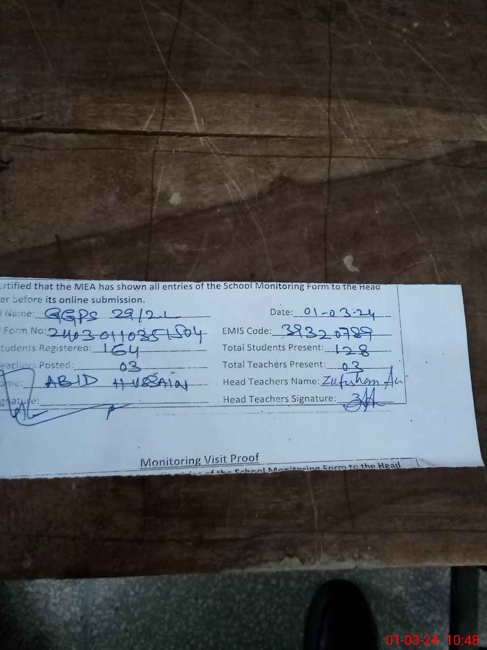 | Name: Zu**** Al**** Designation: (School Headmaster's/Headmistress's) PST Phone/Cell Number: 03**** |
