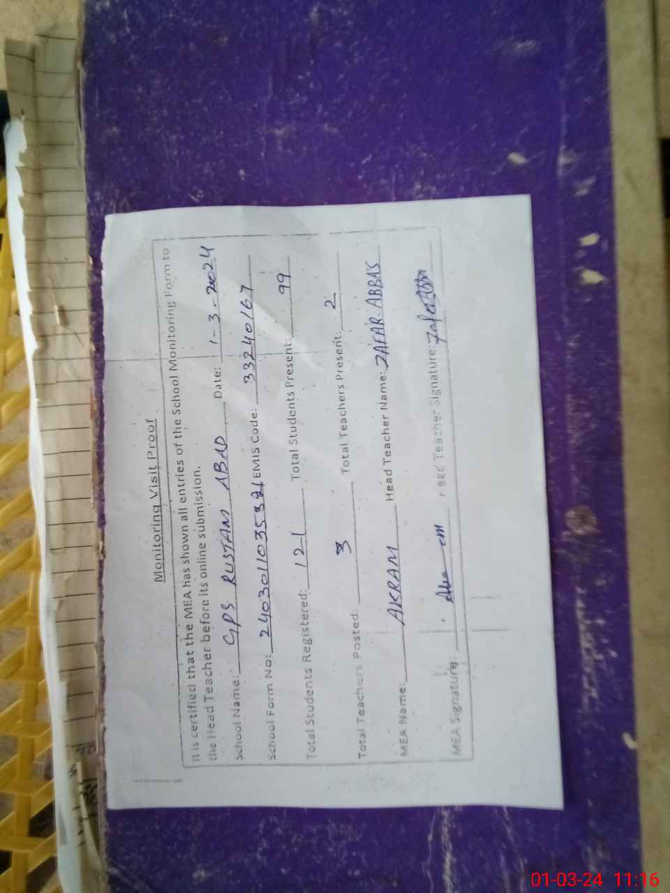 | Attendance Register | Head Teacher | MEA with School | Visit Proof |