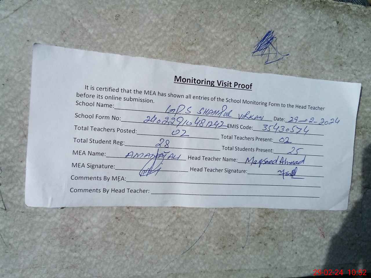 | Attendance Register | Head Teacher | MEA with School | Visit Proof |