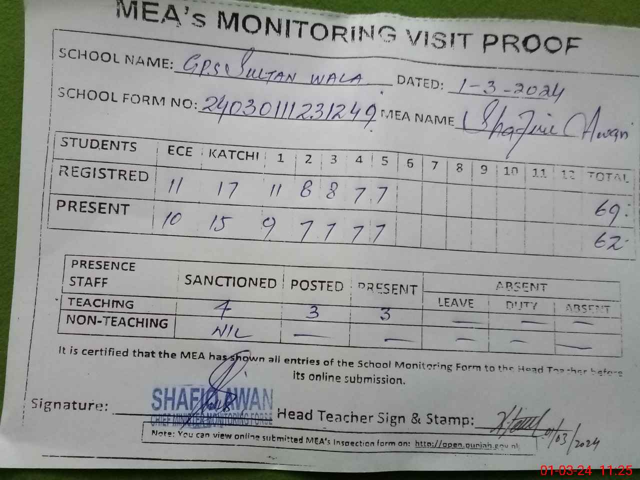 | Attendance Register | Head Teacher | MEA with School | Visit Proof |