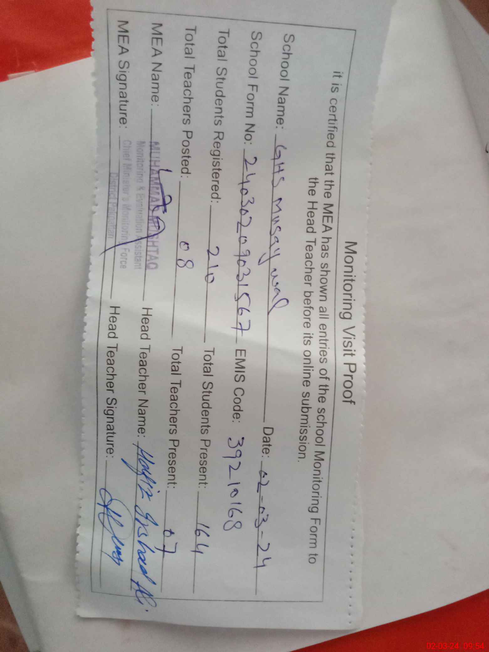 | Attendance Register | Head Teacher | MEA with School | Visit Proof |