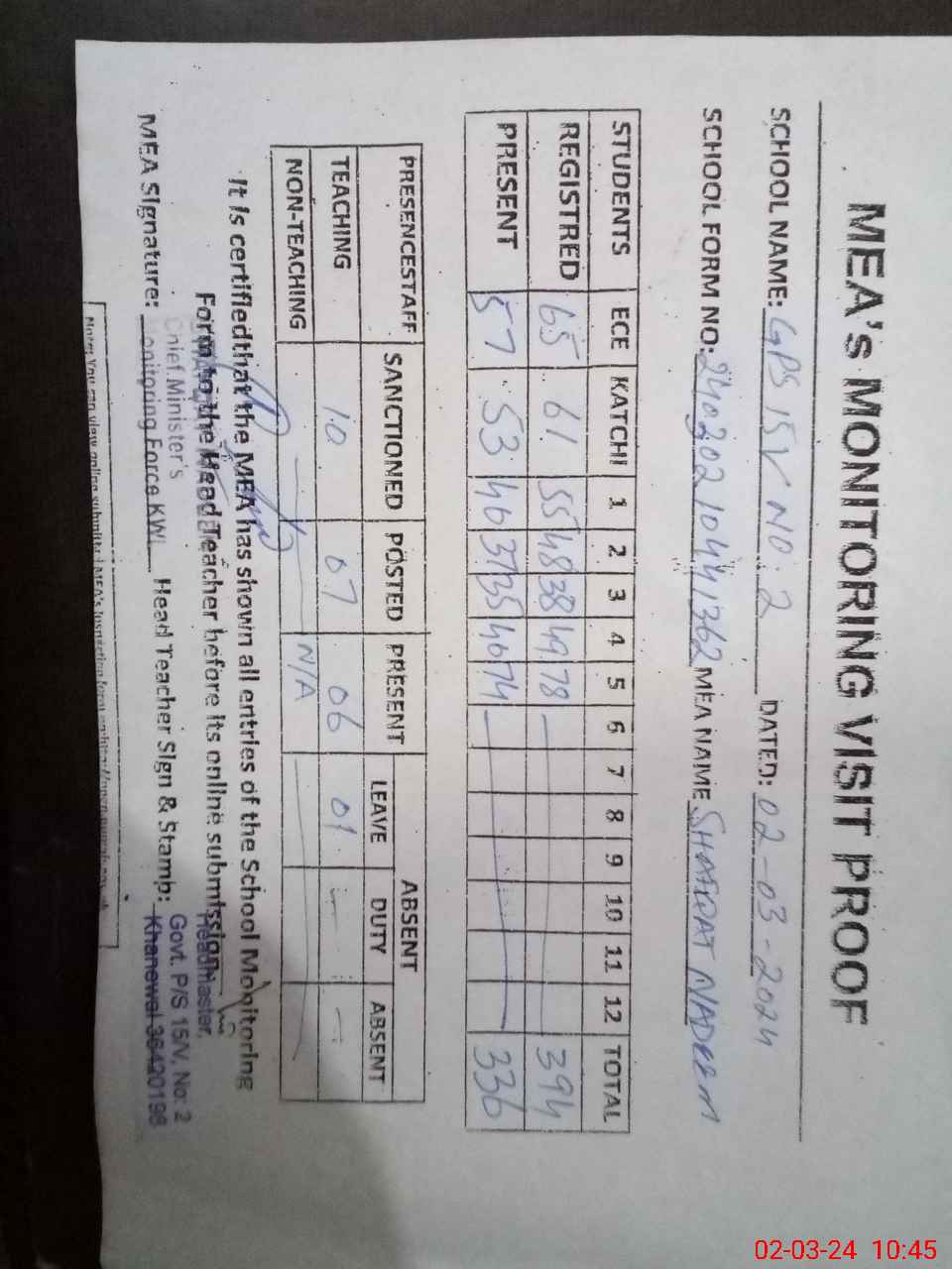 | Attendance Register | Head Teacher | MEA with School | Visit Proof |