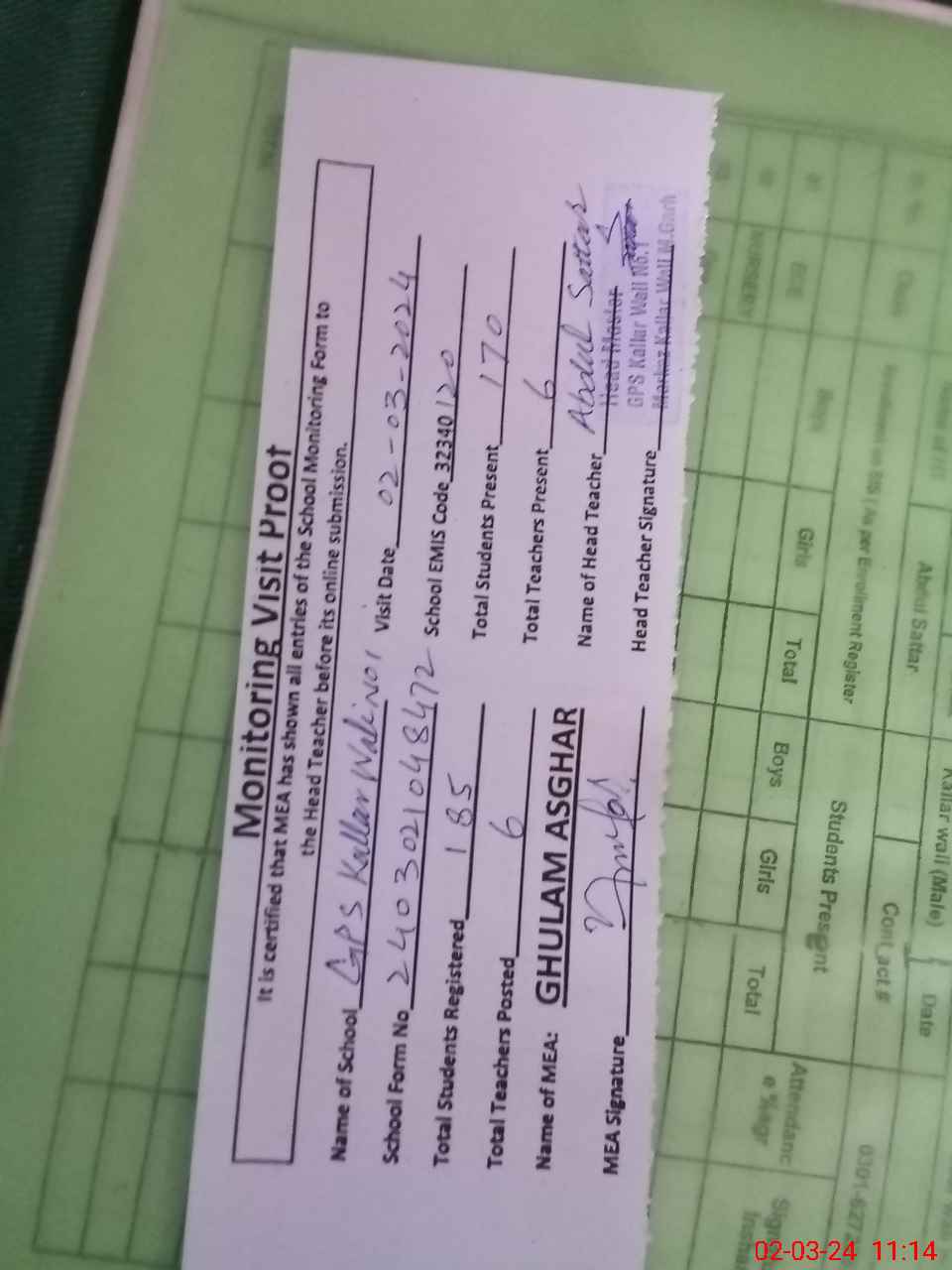 | EMIS Code: 32340120 | Name of School: GPS KALLAR WALI NO.1 | |||