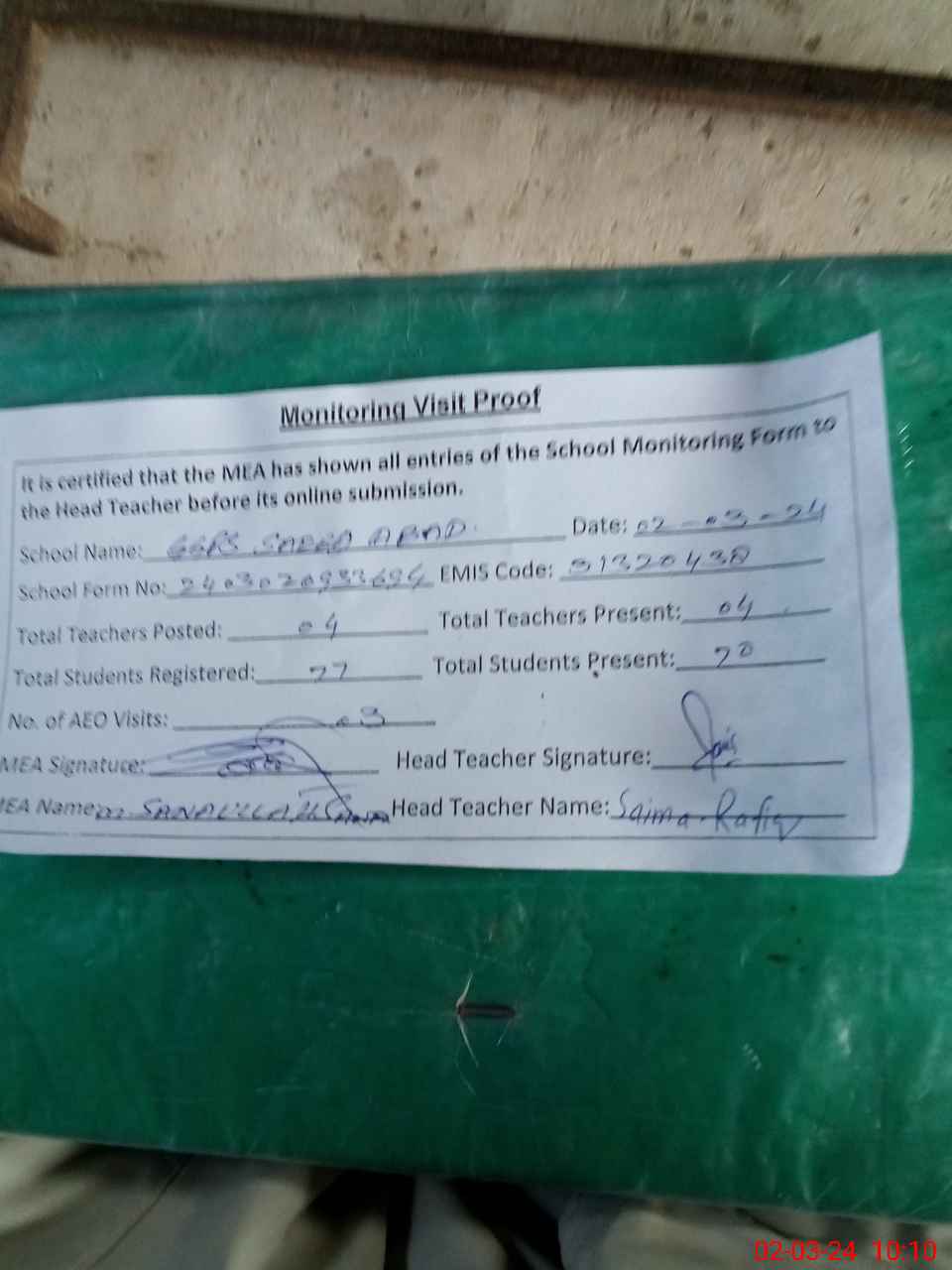 | Attendance Register | Head Teacher | MEA with School | Visit Proof |