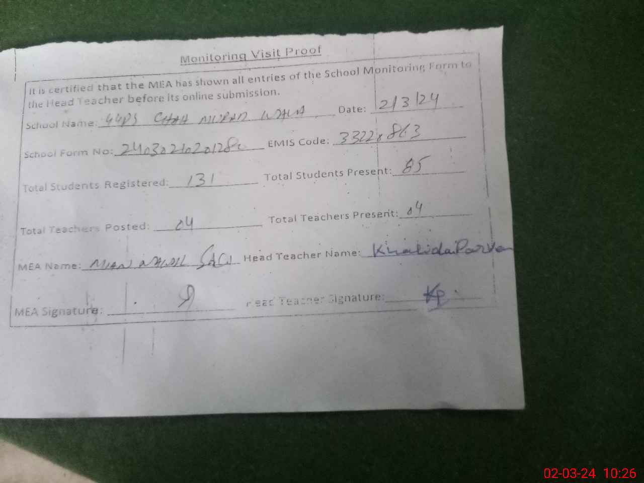 | Attendance Register | Head Teacher | MEA with School | Visit Proof |