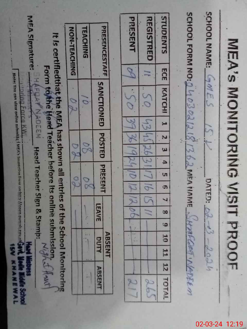 | Attendance Register | Head Teacher | MEA with School | Visit Proof |