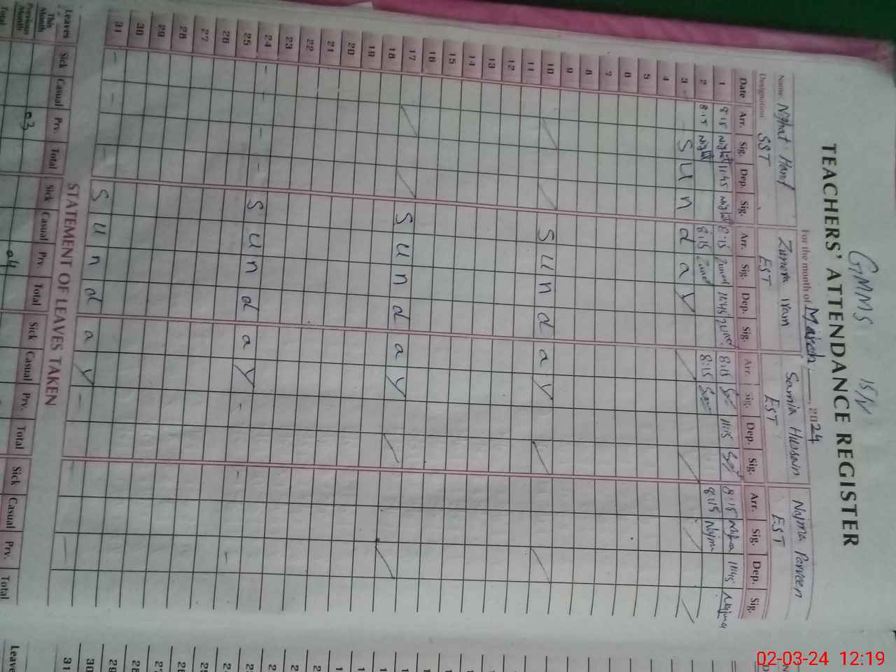 | CNIC | Full Name | Designation | R/C | Absence During Last Calender Month |
