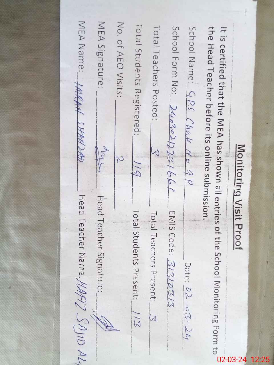 | EMIS Code: 31310313 | Name of School: GPS CHAK NO. 9/P | |||
