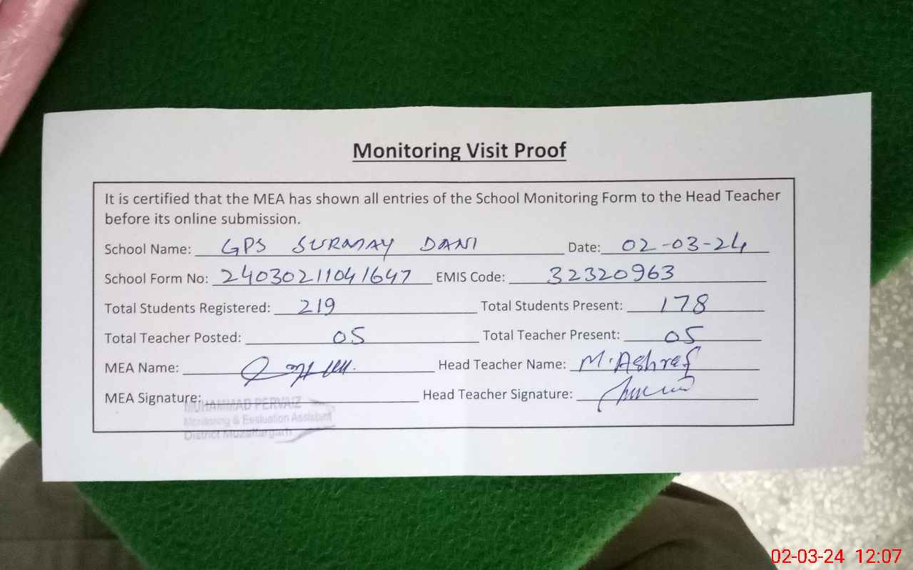 | EMIS Code: 32320963 | Name of School: GPS SURMAY DANI | |||