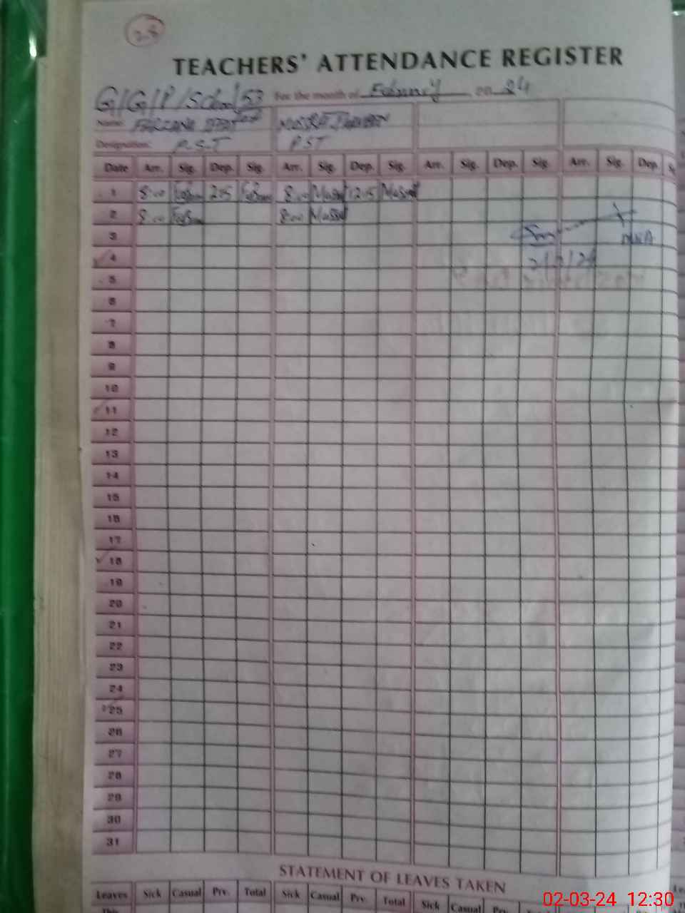 | No. of Students Present - Male | 0 | 0 | 0 | 0 | 0 | 0 | 0 | 0 | 0 | 0 | 0 | 0 | ||||